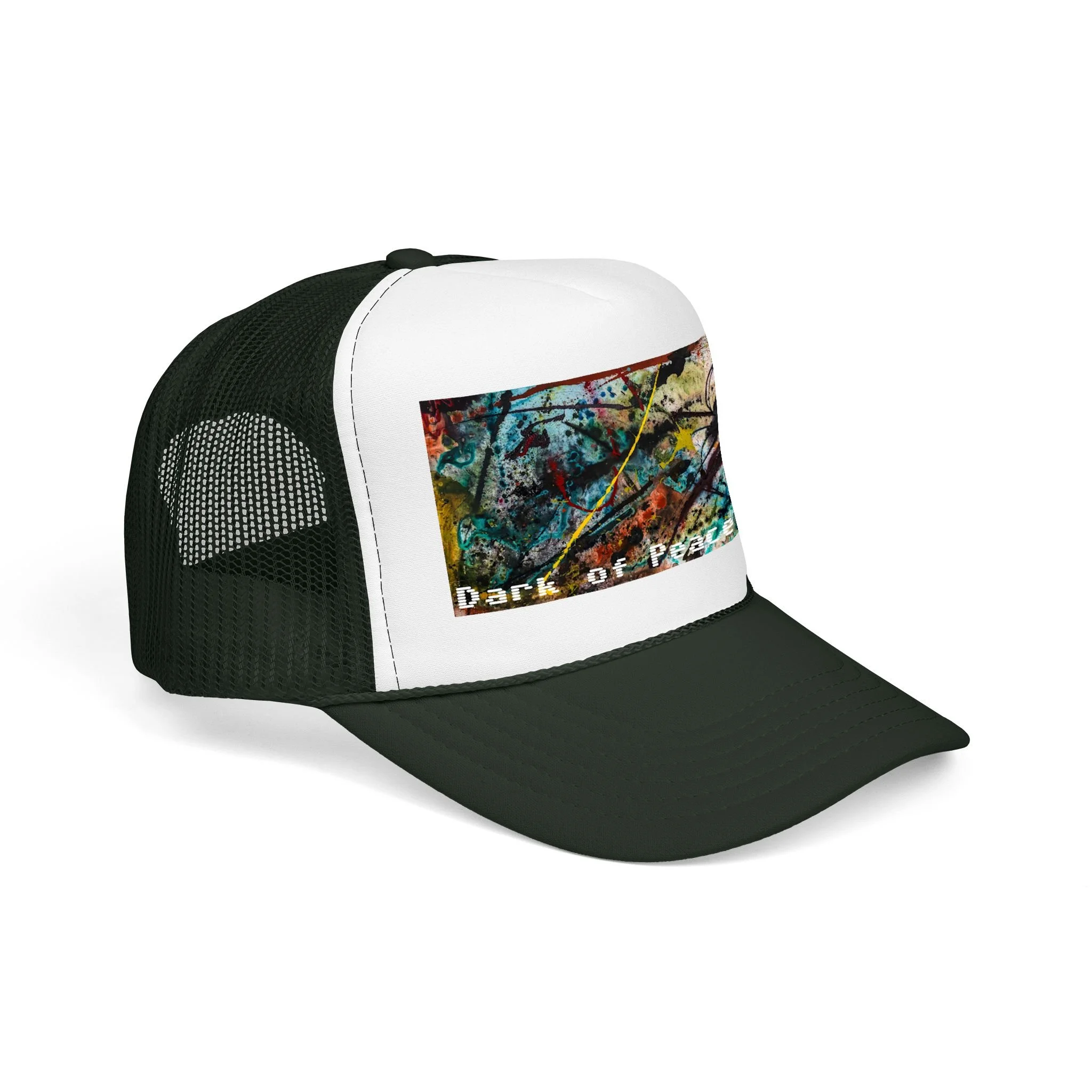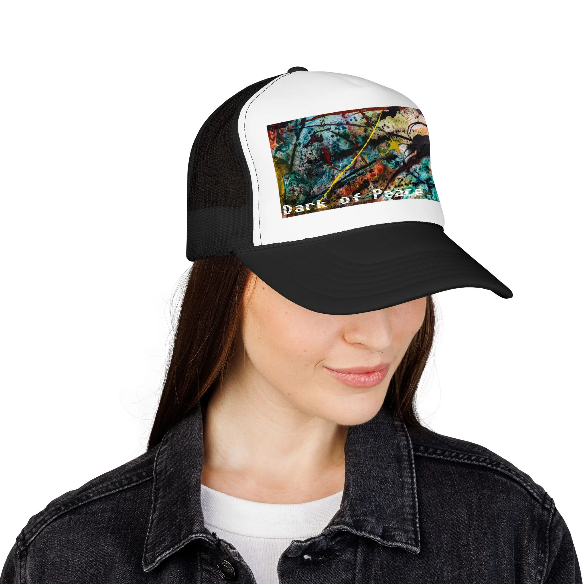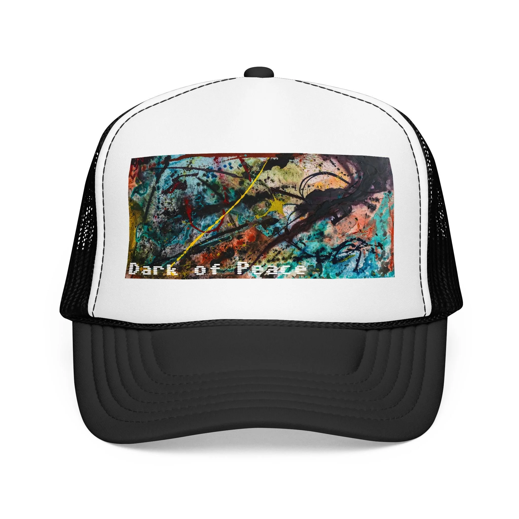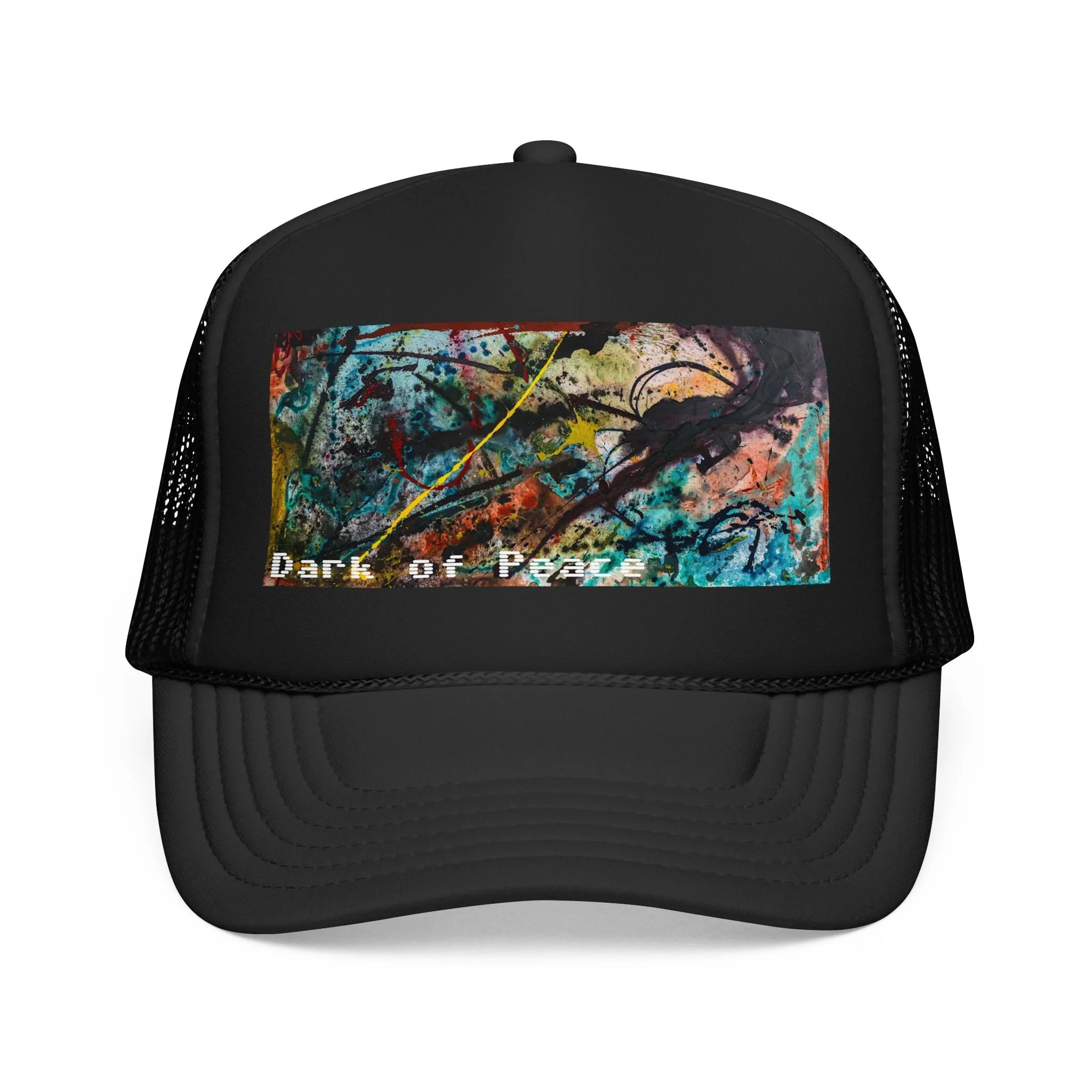 This foam trucker hat brings a moody, underground edge to everyday wear. A seamless foam front displays a grainy, high-contrast saturated graphic of a single intense eye and shadowed textures, with the distressed text “Dark of Peace” tucked beneath. The high-profile, structured silhouette and thicker laminated foam lend presence and shape, while the breathable mesh back keeps it wearable on long days. It lives in the corner of late-night drives, DIY shows, and dim galleries — a low-lit statement piece that reads like an inside reference to those who prefer atmosphere over flash.
