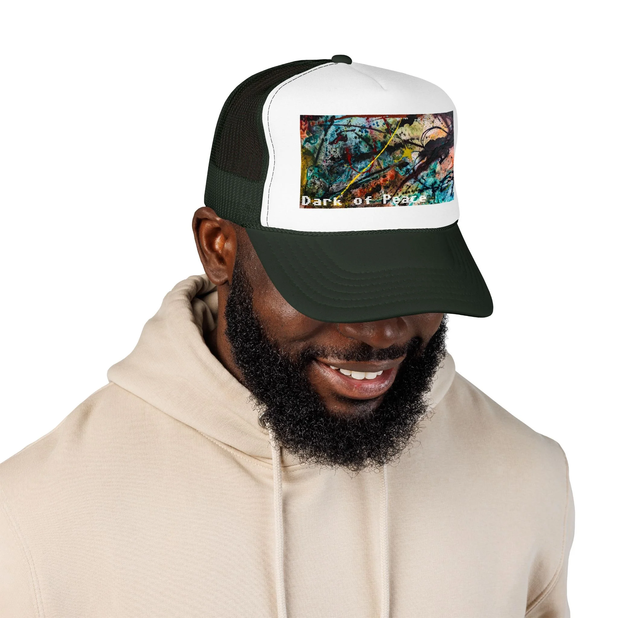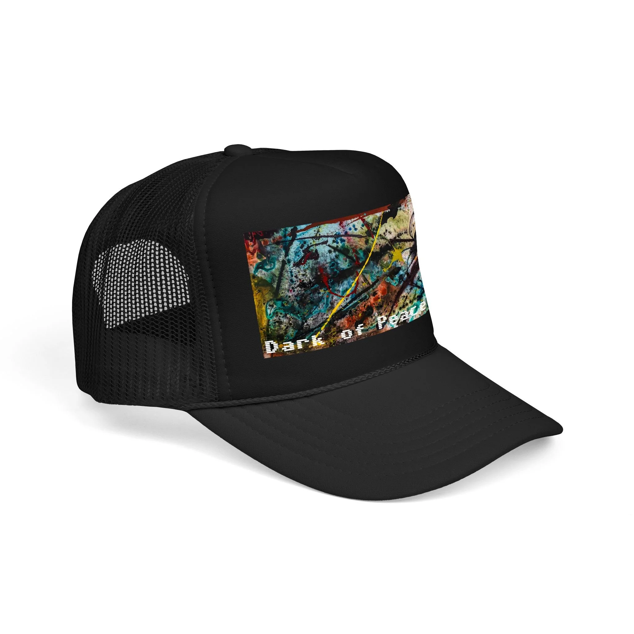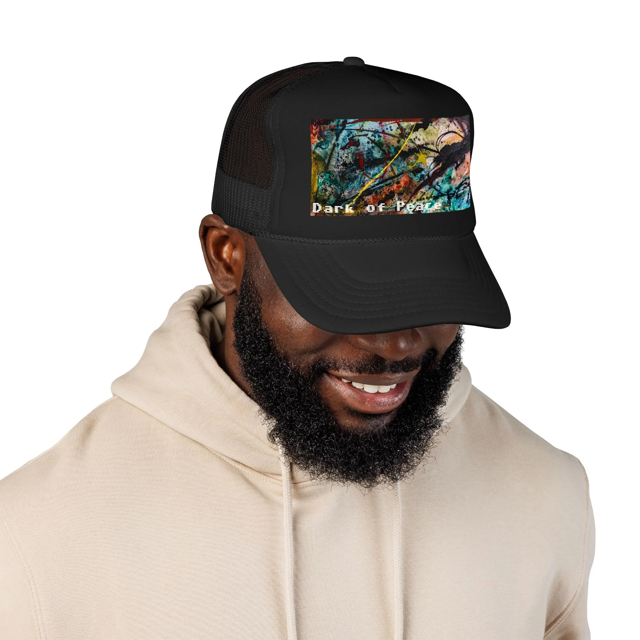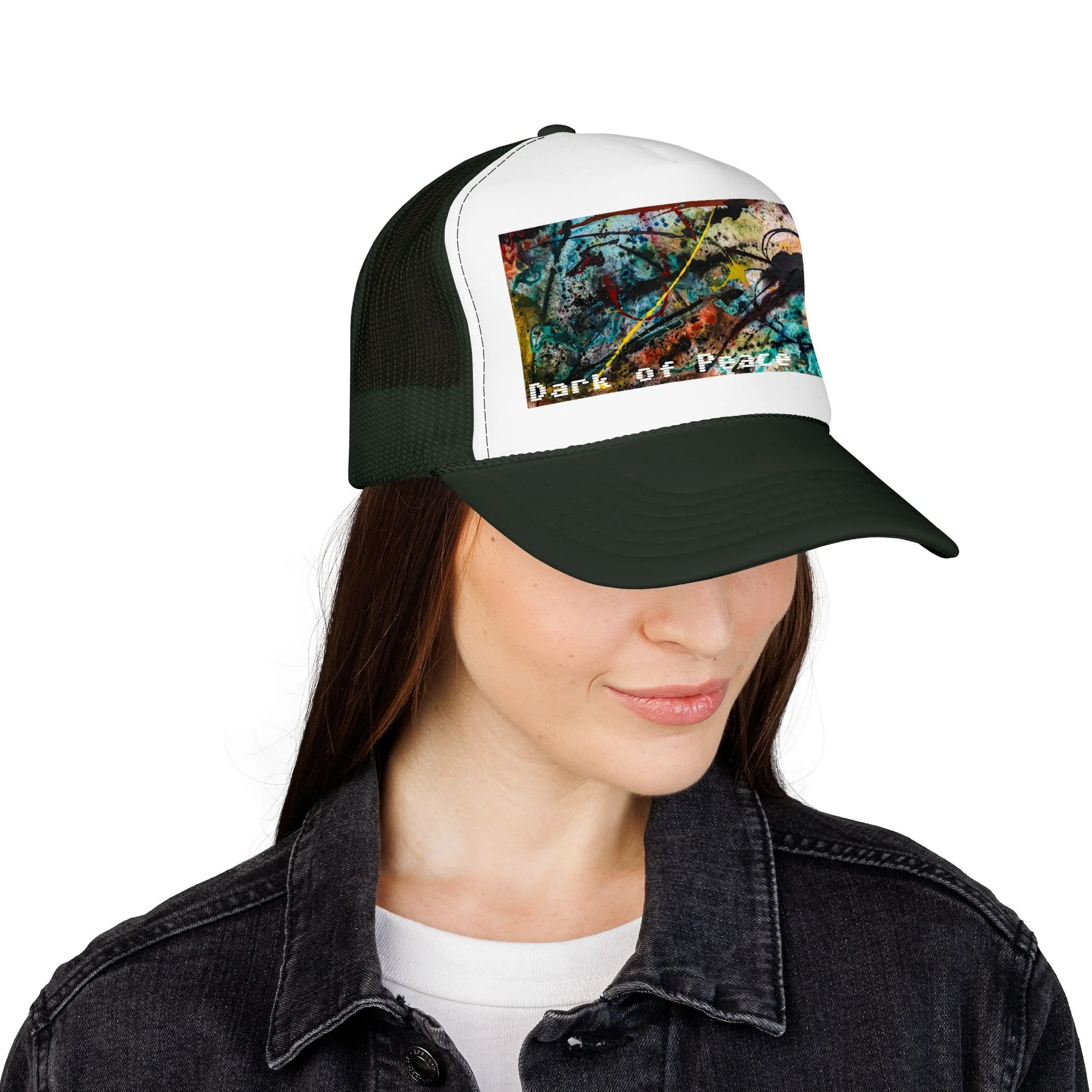 This foam trucker hat brings a moody, underground edge to everyday wear. A seamless foam front displays a grainy, high-contrast saturated graphic of a single intense eye and shadowed textures, with the distressed text “Dark of Peace” tucked beneath. The high-profile, structured silhouette and thicker laminated foam lend presence and shape, while the breathable mesh back keeps it wearable on long days. It lives in the corner of late-night drives, DIY shows, and dim galleries — a low-lit statement piece that reads like an inside reference to those who prefer atmosphere over flash.