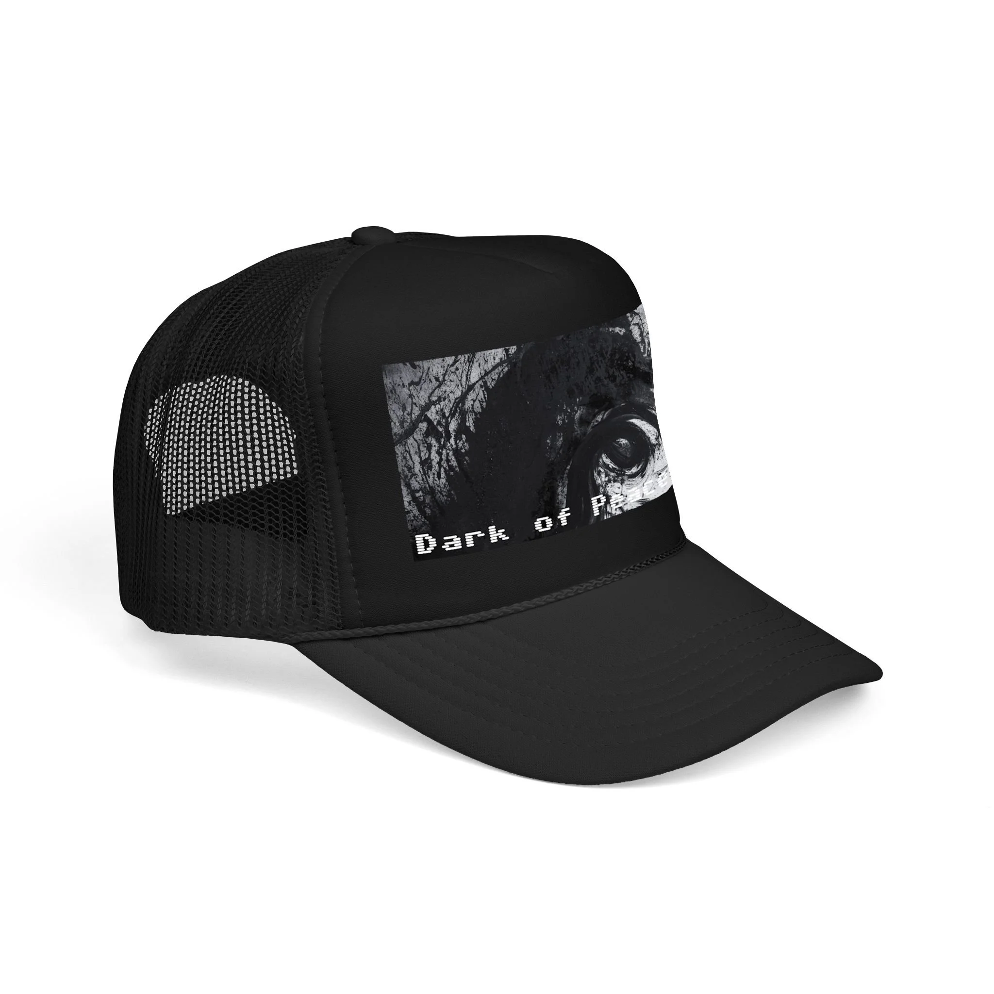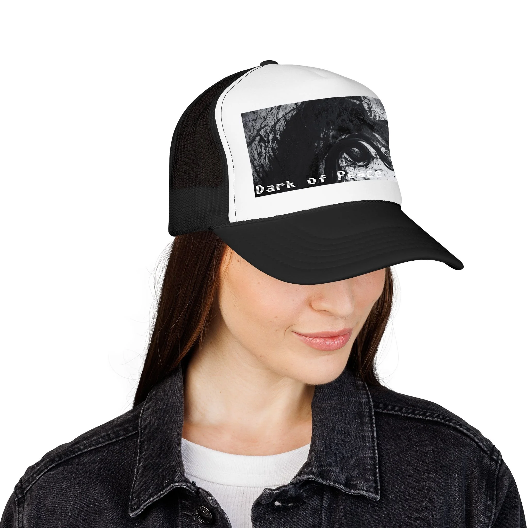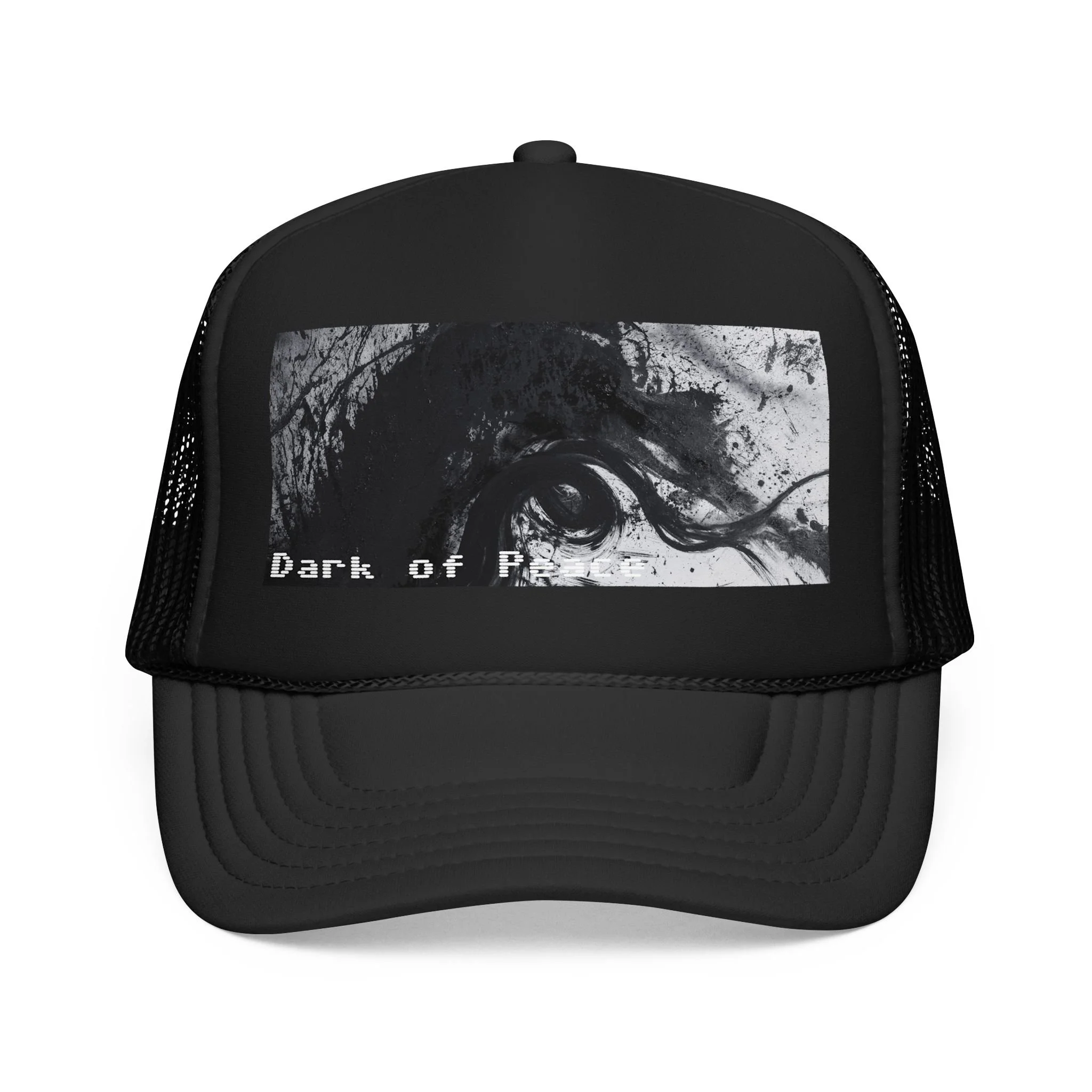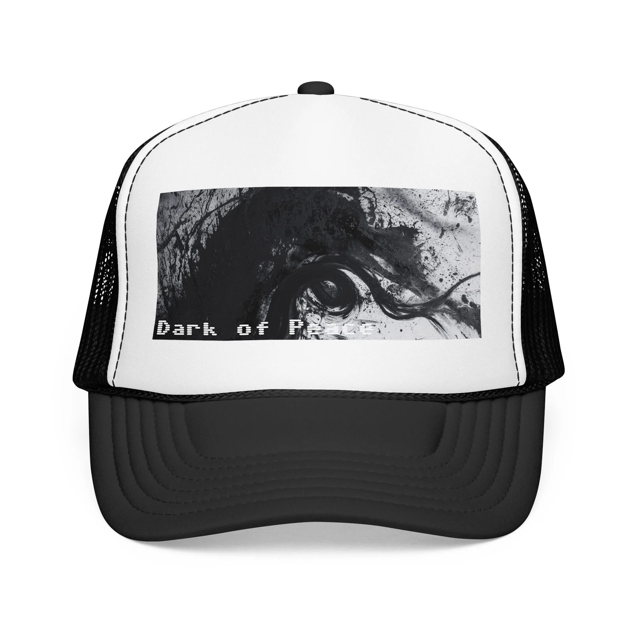 This foam trucker hat brings a moody, underground edge to everyday wear. A seamless foam front displays a grainy, high-contrast black-and-white graphic of a single intense eye and shadowed textures, with the distressed text “Dark of Peace” tucked beneath. The high-profile, structured silhouette and thicker laminated foam lend presence and shape, while the breathable mesh back keeps it wearable on long days. It lives in the corner of late-night drives, DIY shows, and dim galleries — a low-lit statement piece that reads like an inside reference to those who prefer atmosphere over flash.
