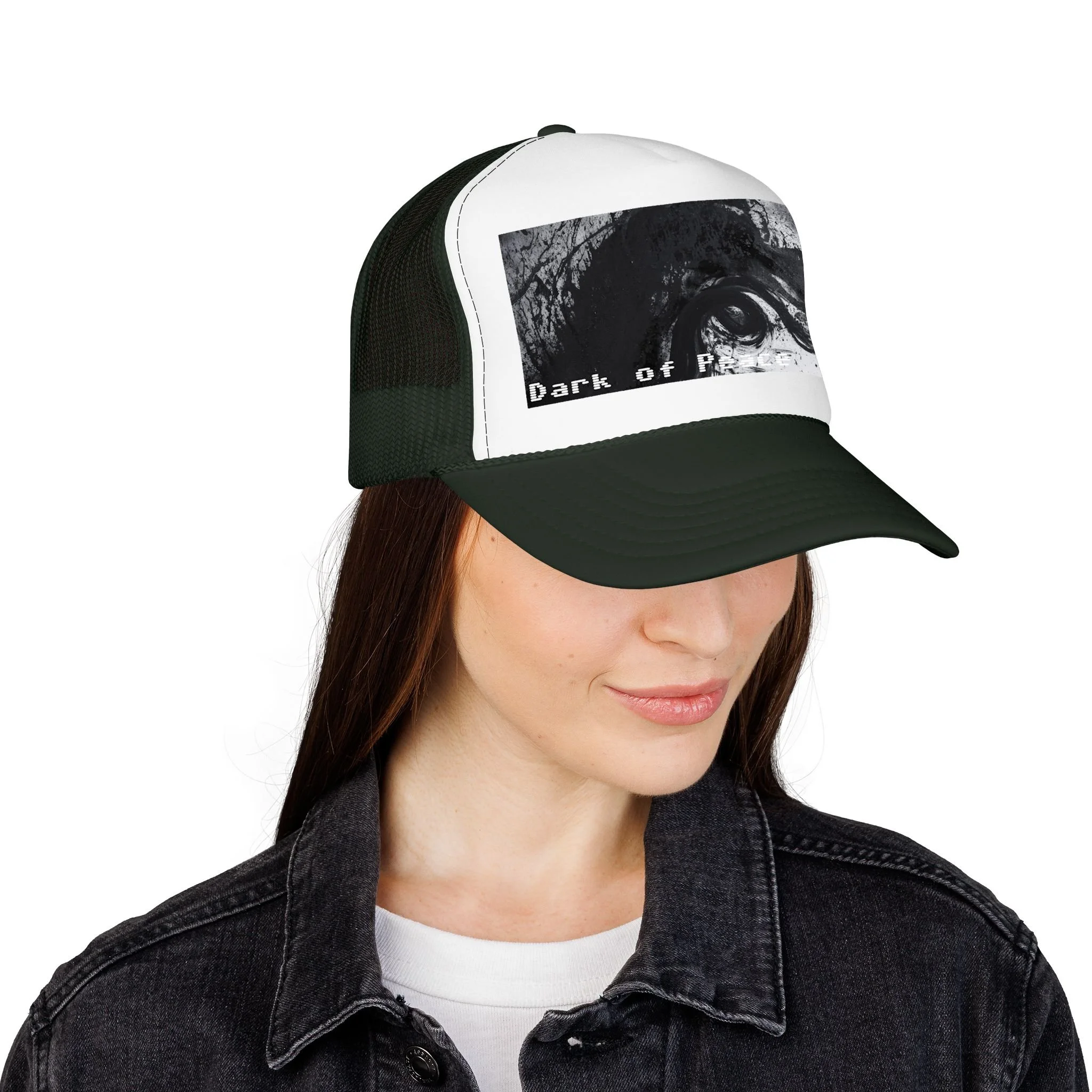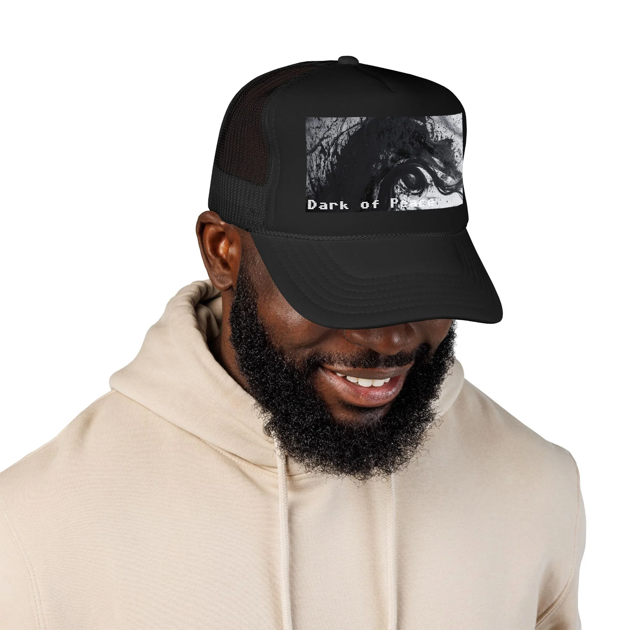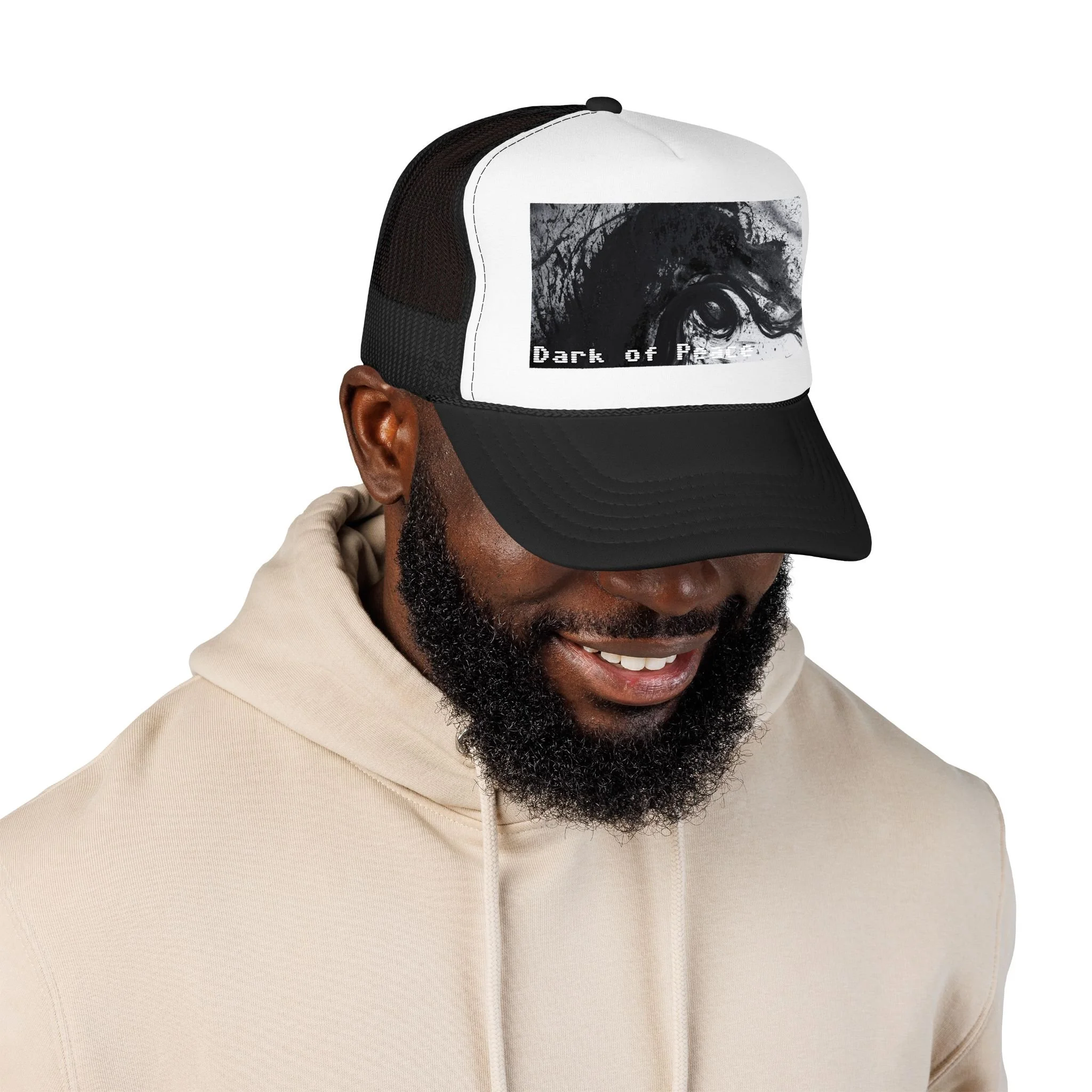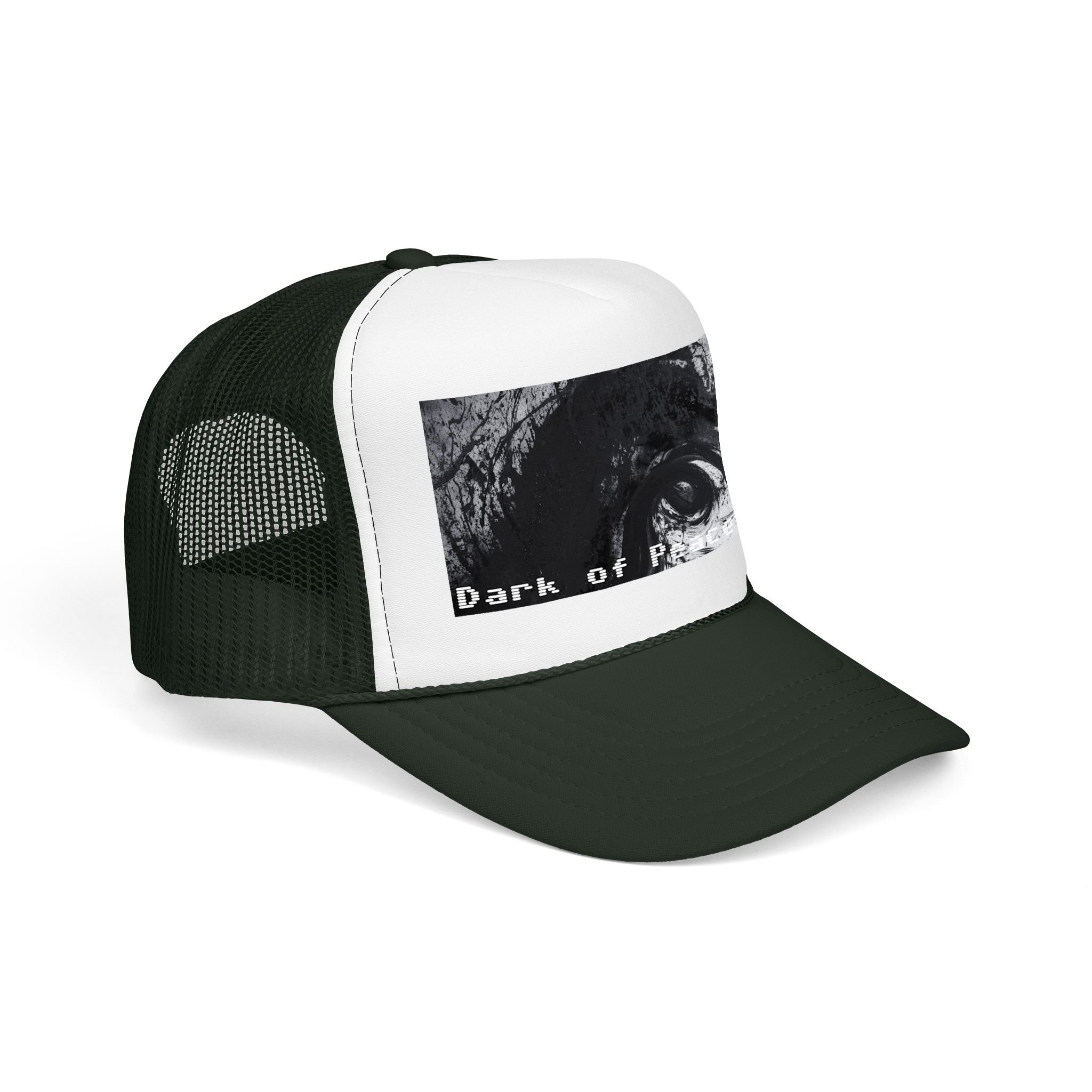 This foam trucker hat brings a moody, underground edge to everyday wear. A seamless foam front displays a grainy, high-contrast black-and-white graphic of a single intense eye and shadowed textures, with the distressed text “Dark of Peace” tucked beneath. The high-profile, structured silhouette and thicker laminated foam lend presence and shape, while the breathable mesh back keeps it wearable on long days. It lives in the corner of late-night drives, DIY shows, and dim galleries — a low-lit statement piece that reads like an inside reference to those who prefer atmosphere over flash.