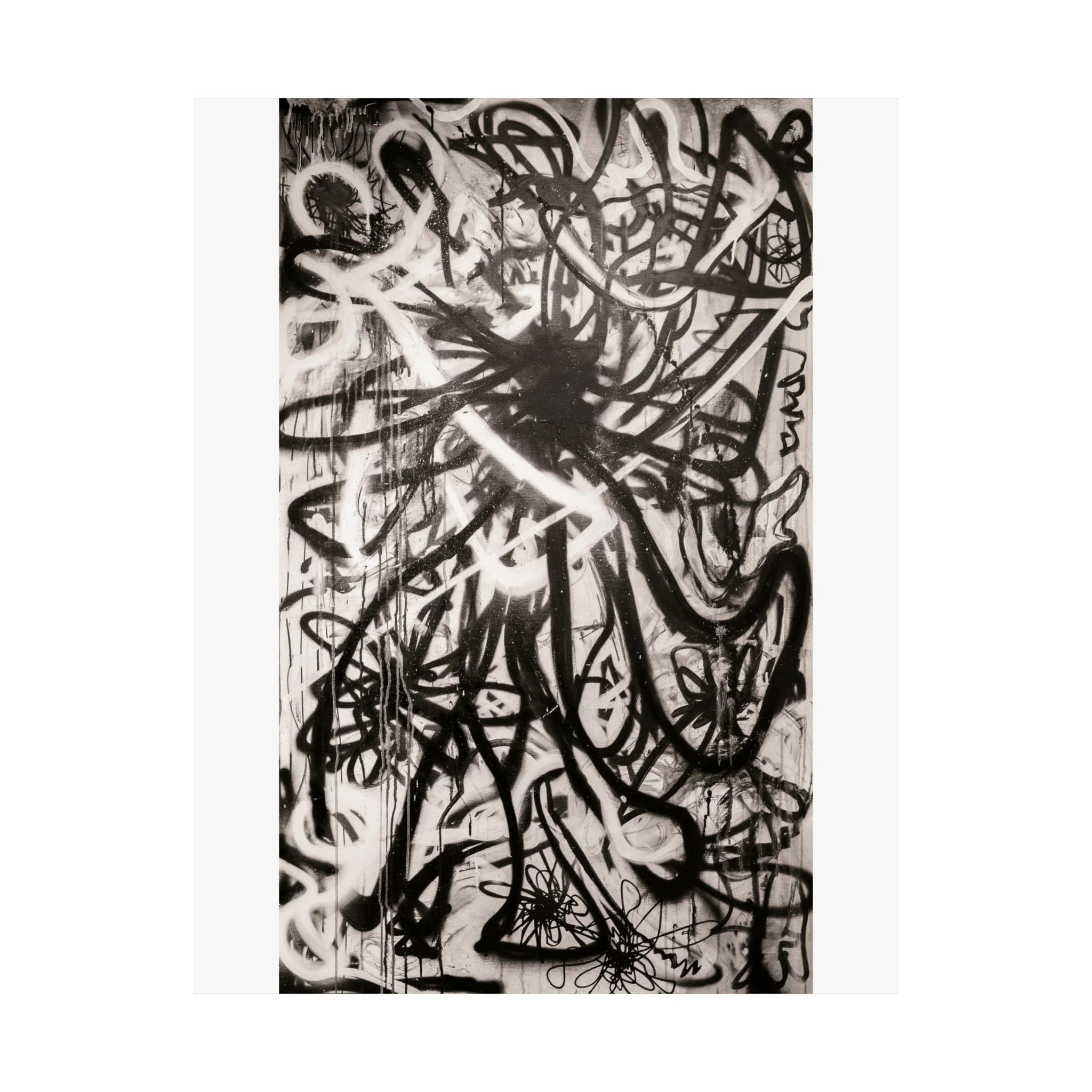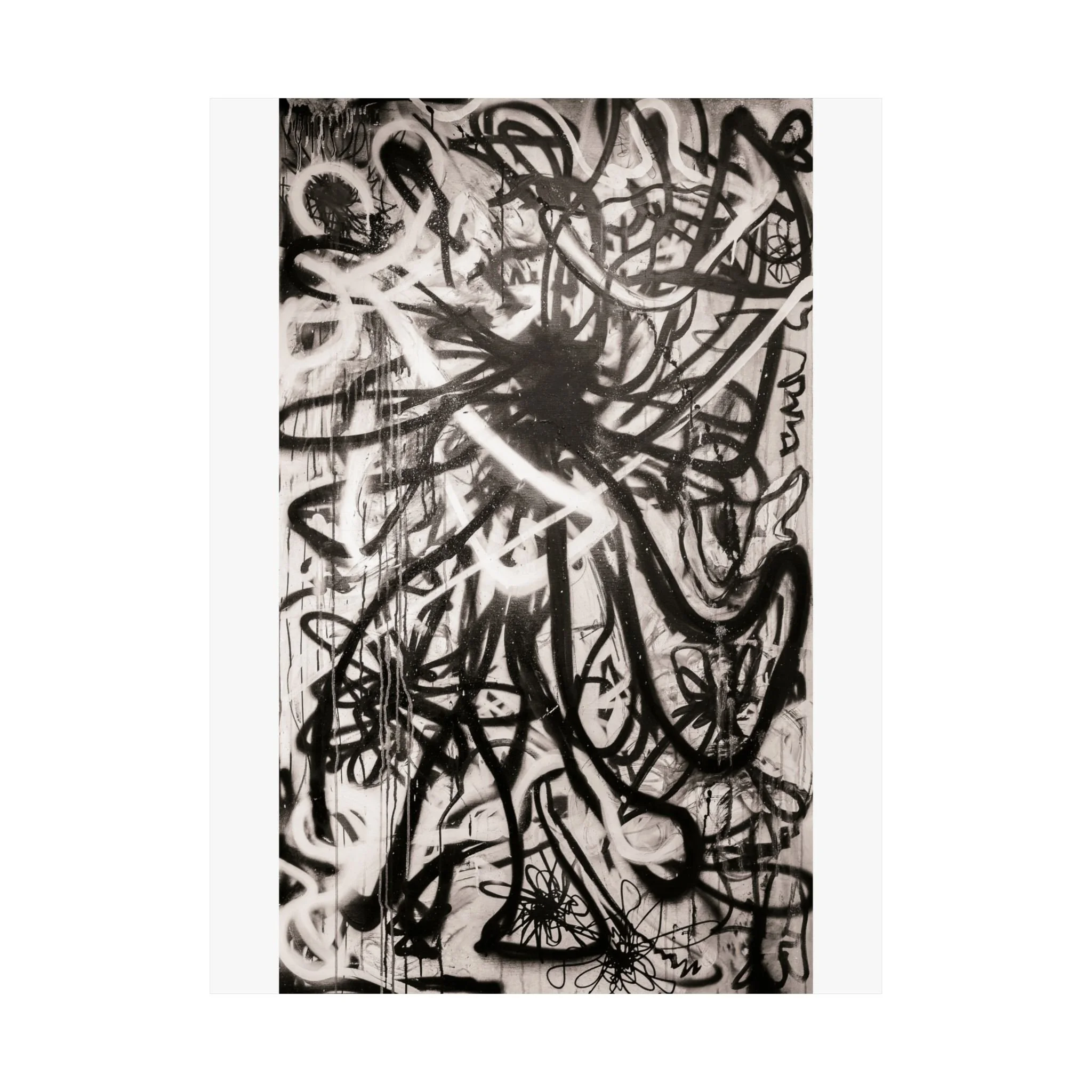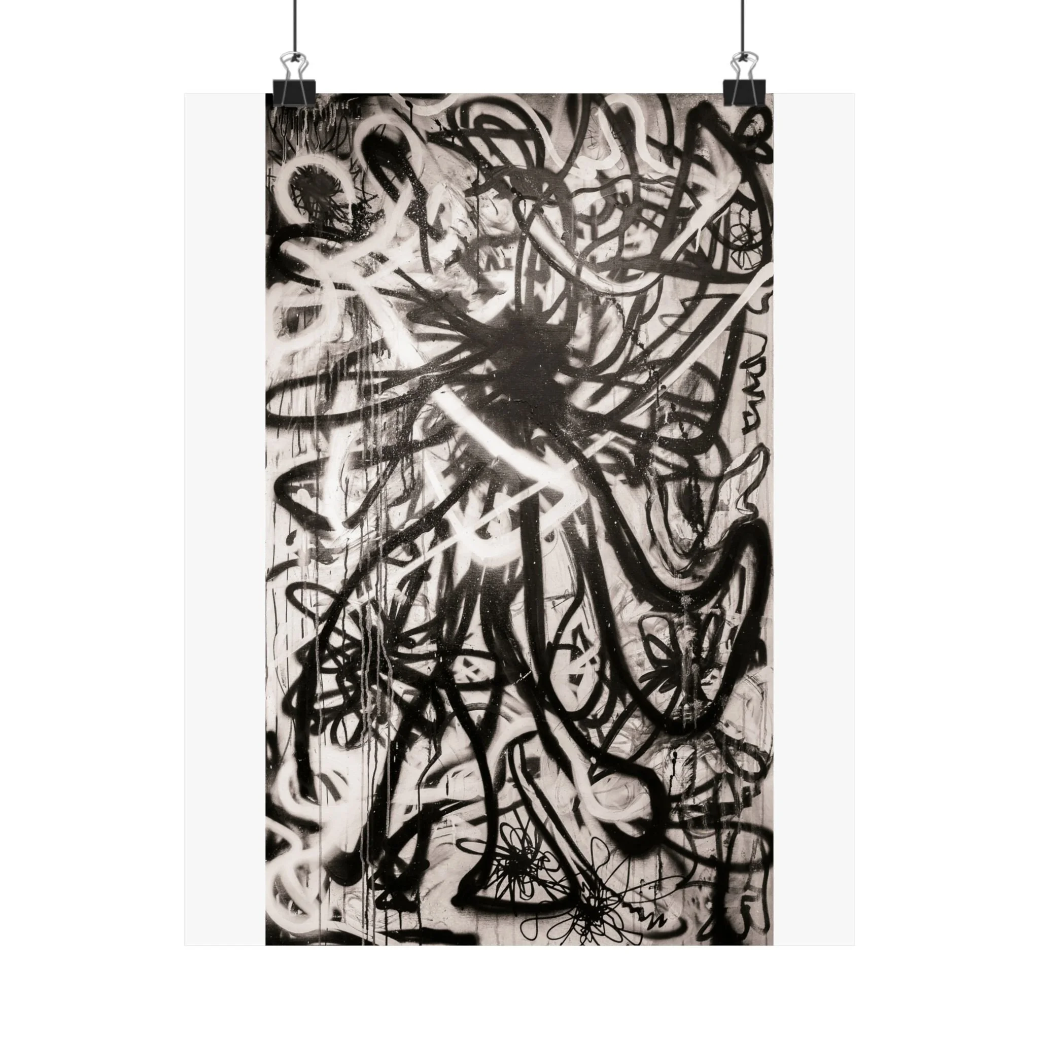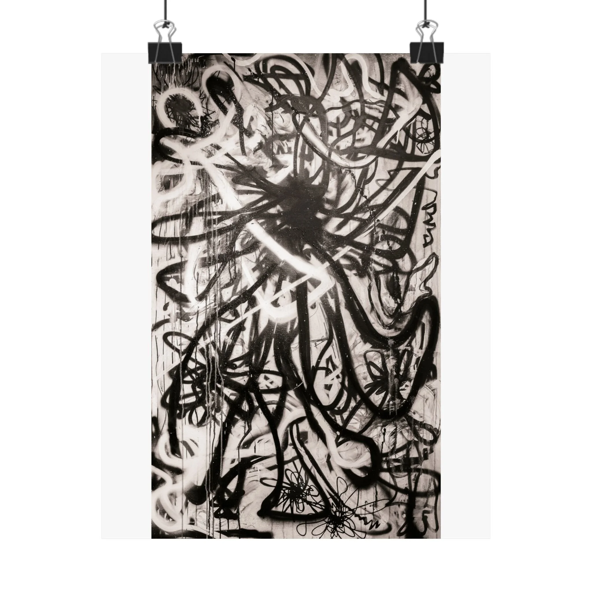 Deep blacks, stark whites, and raw contrast — this matte vertical poster brings a moody, graffiti-inspired abstract into any indoor space. It reads like a back-alley mural distilled to its essentials: bold strokes, layered texture, and high-contrast shapes that pull the eye and hold it. Hang it in a studio, living room, or gallery wall to add an edge of urban art and contemplative tension. The archival museum-grade paper and giclée printing keep those intense tones stable over time, so the piece keeps its atmosphere through years of quiet observation. Sizes range widely, so you can place a single dramatic statement or build a grid of variations for a curated, streetwise display.