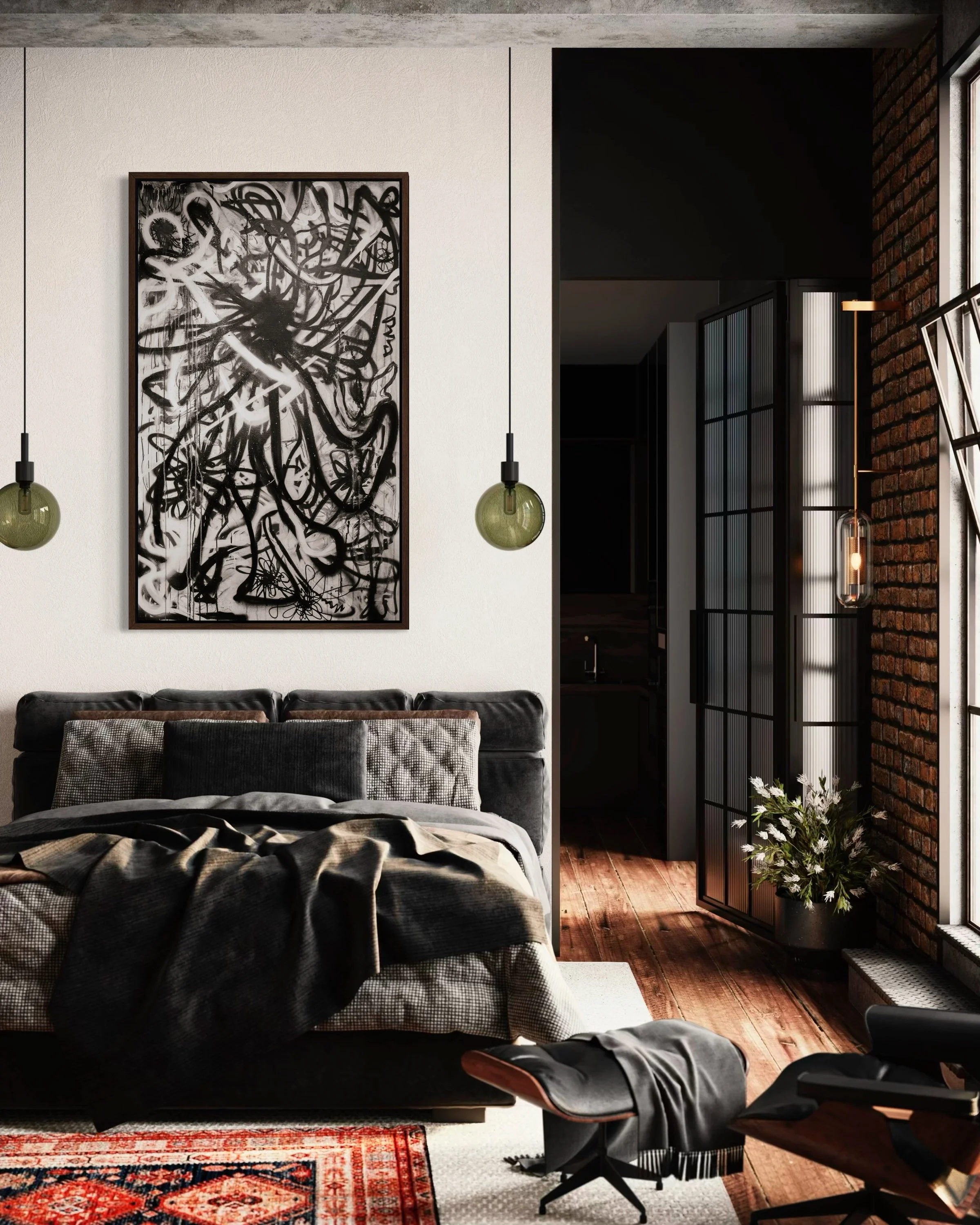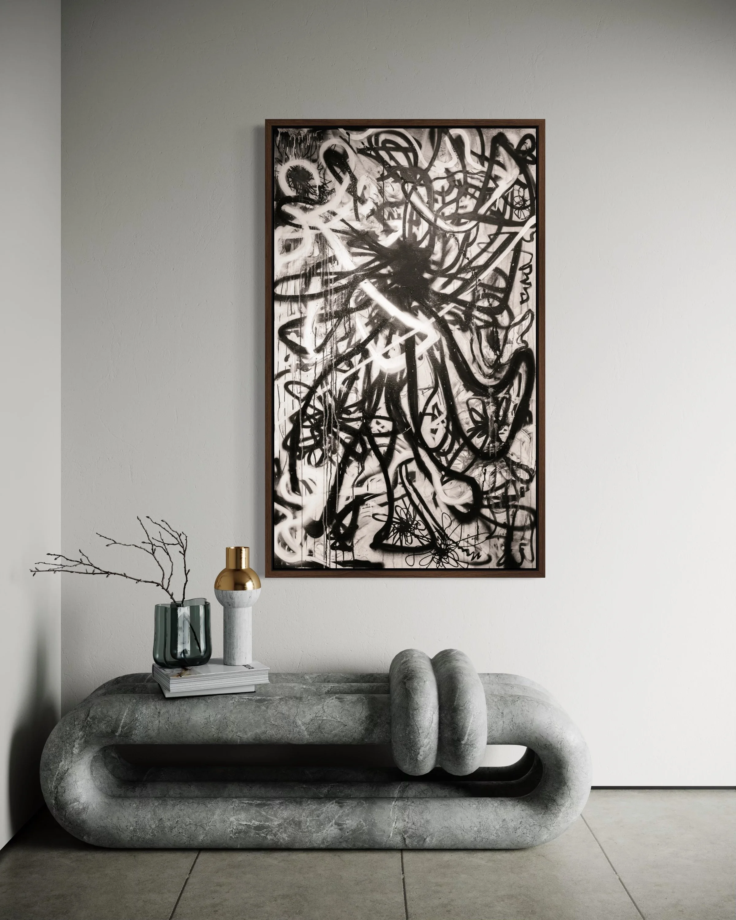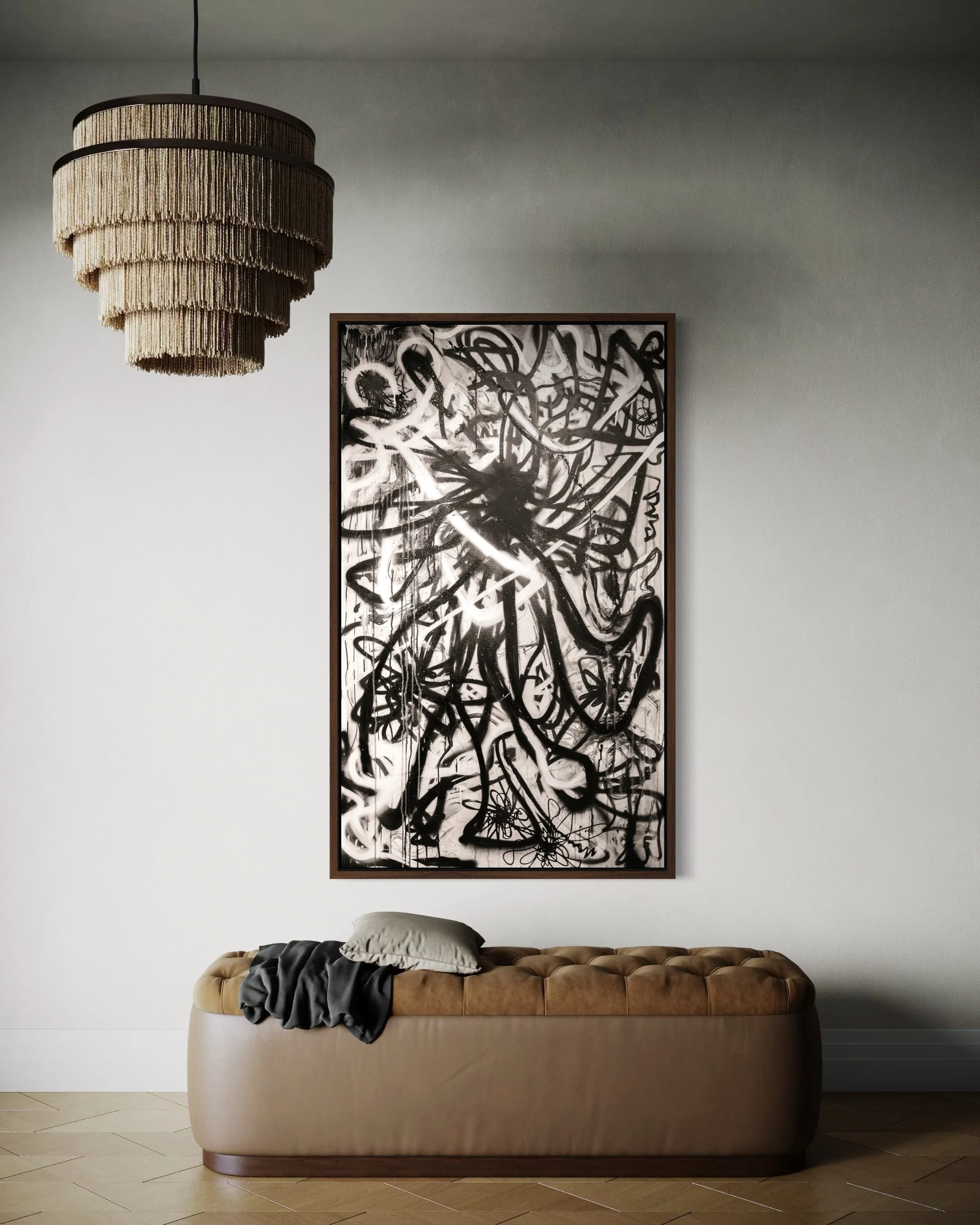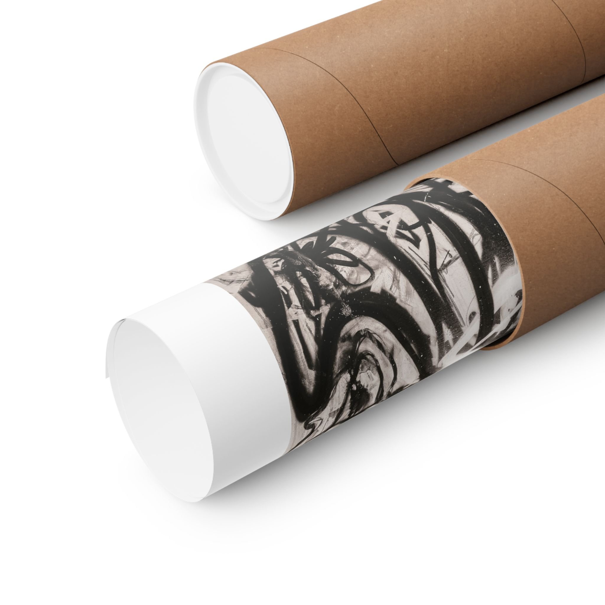 Deep blacks, stark whites, and raw contrast — this matte vertical poster brings a moody, graffiti-inspired abstract into any indoor space. It reads like a back-alley mural distilled to its essentials: bold strokes, layered texture, and high-contrast shapes that pull the eye and hold it. Hang it in a studio, living room, or gallery wall to add an edge of urban art and contemplative tension. The archival museum-grade paper and giclée printing keep those intense tones stable over time, so the piece keeps its atmosphere through years of quiet observation. Sizes range widely, so you can place a single dramatic statement or build a grid of variations for a curated, streetwise display.